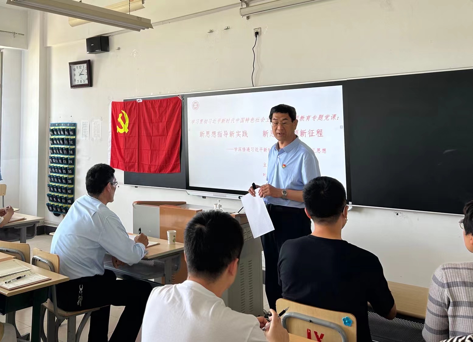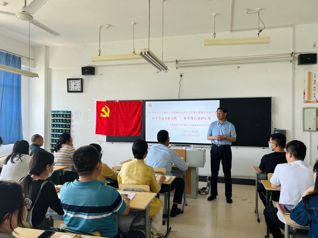 刘玉宝结合专题党课教育对全体师生党员提出要求:一要坚持不懈地用党的创新理论凝心铸魂。坚持读原著、学原文、悟原理,在通读、精读、研读上下功夫,在深化、内化、转化上下功夫,继续全面深入学习贯彻习近平新时代中国特色社会主义思想,用马克思主义中国化、时代化的最新理论成果武装头脑,以期实现理论学习有新收获、思想境界有新提升、党性修养有新增强的目标。二要深刻领悟“两个确立”的决定性意义。全体师生党员务必要将“两个确立”真正转化为坚决做到“两个维护”的思想自觉、政治自觉、行动自觉,不断提高政治判断力、政治领悟力、政治执行力,不断增强爱戴核心、维护核心、跟随核心、捍卫核心的自觉性和坚定性。三要高度重视用科学的理论指导实践、推动工作。要深刻理解并准确把握习近平新时代中国特色社会主义思想蕴含的马克思主义立场、观点和方法,牢记“国之大者”,团结带领全院师生员工坚定信心、同心同德,埋头苦干、攻坚克难,以习近平新时代中国特色社会主义思想为指导,围绕学校重点攻坚突破项目,贯彻新发展理念,推动学院事业高质量发展。