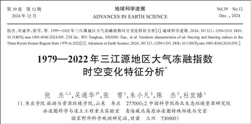 近日,永利yl23411集团黄河流域绿色发展研究中心团队在三江源地区大气冻融指数研究方面取得最新进展,相关工作发表在期刊《地球科学进展》上,论文题目为“1979—2022年三江源地区大气冻融指数时空变化特征分析”。