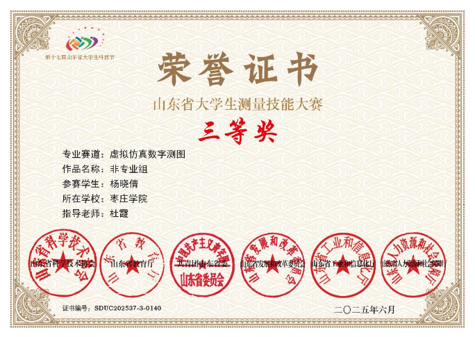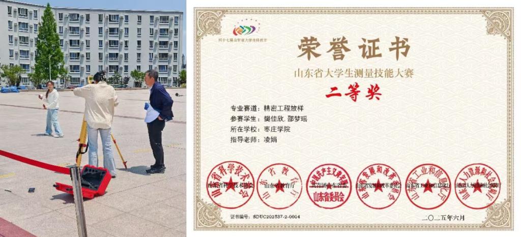 2025年5月,在第十九届“南方测绘杯”山东省大学生测量技能大赛中,永利yl23411集团学子以精湛的专业技能和迎难而上的拼搏精神,斩获两项大奖:邵梦瑶、樊佳欣团队荣获精密工程放样赛项二等奖,曹楚若、杨晓倩分获虚拟仿真数字测图赛项三等奖,展现了学院测绘学科人才培养的卓越成果。