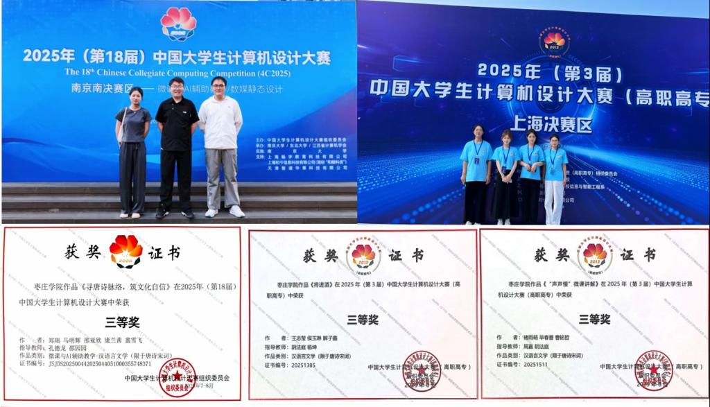 近日,2025年(第18届)中国大学生计算机设计大赛(本科赛道与高职高专赛道)、第十三届山东省师范类高校学生从业技能大赛以及第十五届全国大学生红色旅游创意策划大赛初赛陆续落下帷幕,我院学子分别在三项赛事不同类别竞赛中喜获佳绩。