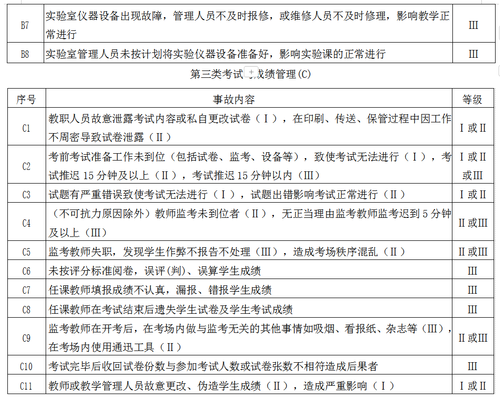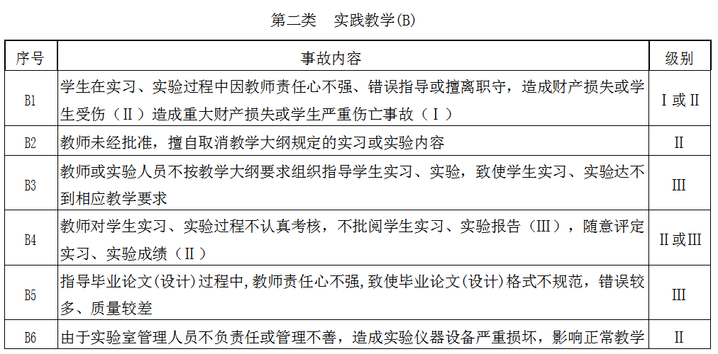 第五条教学事故依据教学与管理等不同环节分为课堂教学(A)、实践教学(B)、考试与成绩管理(C)、教学管理工作(D)、教材(E)、教学保障(F)六大类。根据事故性质和所造成的影响程度分为三个级别:“Ⅰ级”为重大教学事故,“Ⅱ级”为较大教学事故,“Ⅲ级”为一般教学事故。