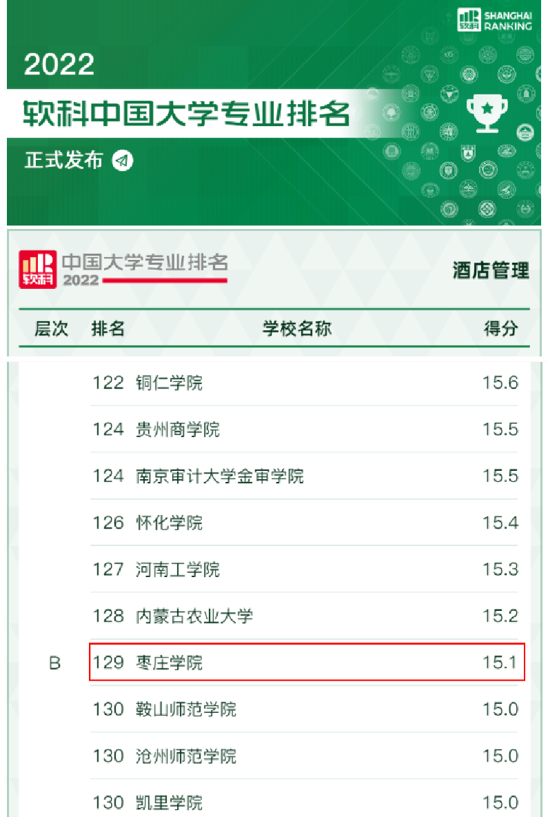 永利yl23411集团酒店管理专业在本次发布的榜单中位列B层次,排名第129位。近年来,我院狠抓本科教育和本科人才培养,积极推进“新文科”建设,此次酒店管理专业的等级评定,是我院近年来持续加强专业建设过程中的一个阶段性成绩,表明我院在学科支撑、专业生源、专业就业和专业条件等评价指标方面取得了较大进展。