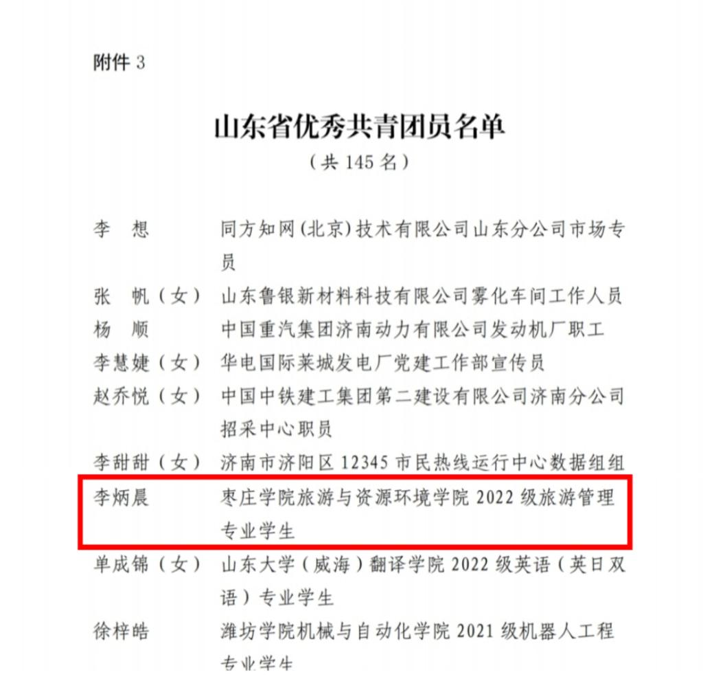 近日,共青团山东省委公布《关于表彰2023-2024年度“山东青年五四先进集体“山东青年五四先进个人”的决定》,我校永利yl23411集团2022级旅游管理专业学生李炳晨荣获“山东省优秀共青团员”荣誉称号。