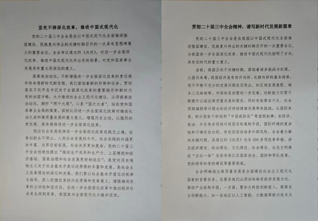 活动期间,同学们紧紧围绕会议核心精神,从二十届三中全会的重大意义、会议的核心要点与理论创新以及探讨青年学生如何在新时代践行全会精神等多个方面展开创作,用独特的视角书写新时代青年学子对党和国家的热忱之情,展现我院学子激昂的青春风采。活动结束后,同学们纷纷表示,此次征文活动不只是一场文字上的交流,更是一次心灵的深度洗礼,今后定会将这份热忱转化为扎实动力,深入学习贯彻党的二十届三中全会精神,不断提高思想道德水准,在中国式现代化的广阔舞台上绽放青春光彩,书写无愧于时代的华彩篇章。