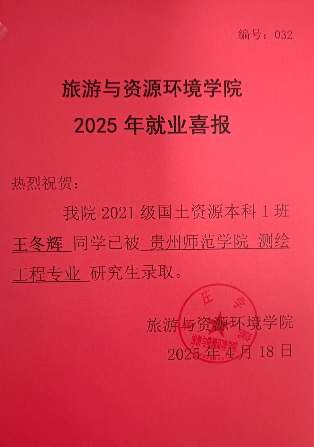 喜报!21国土资源本科1班王冬辉被贵州师范学院录取!