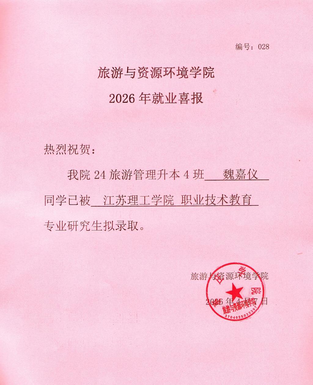 喜报!24旅游管理升本4班魏嘉仪被江苏理工学院录取!