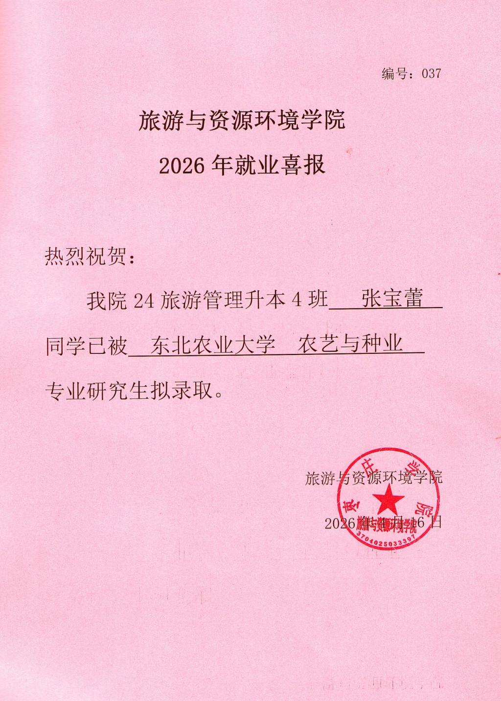 喜报!24旅游管理升本4班张宝蕾被东北农业大学录取!